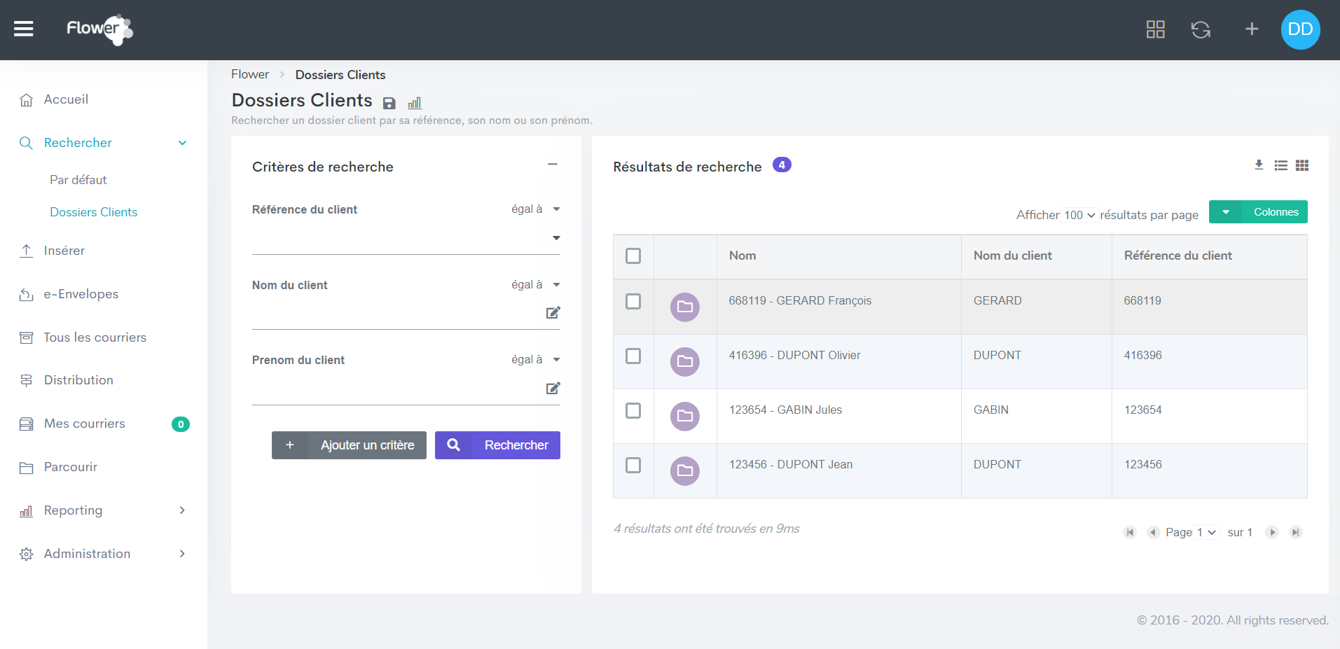 valuefield with dossierClientSearch(fr=Dossiers Client,en=Client folders), - Click on the Savebutton.